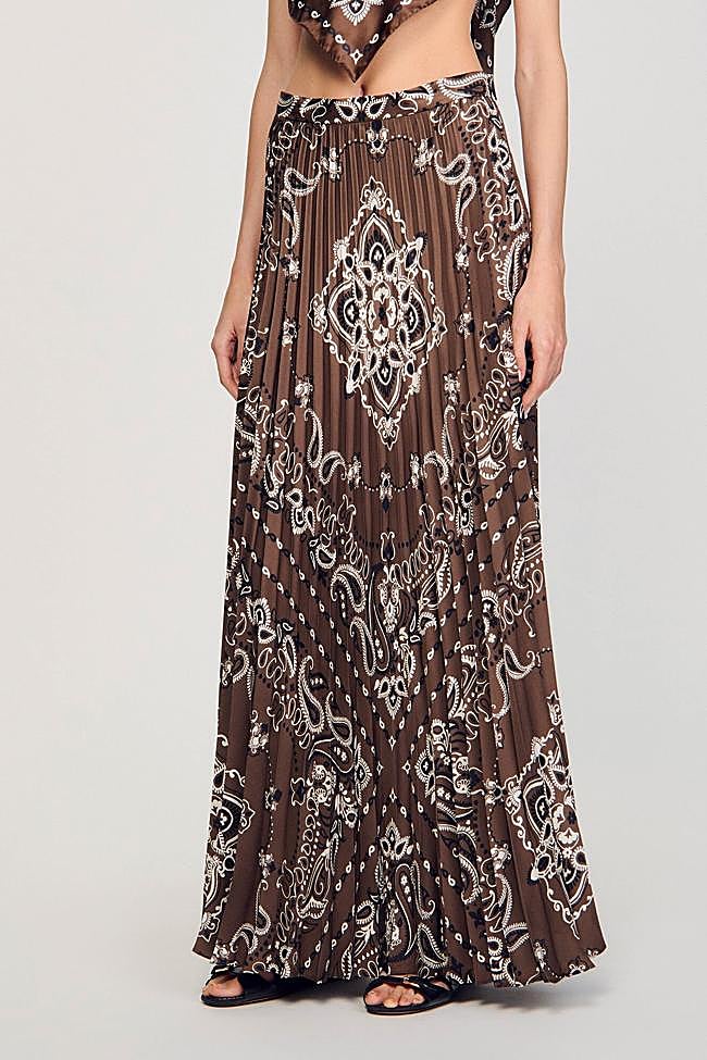 Este es uno de los modelos más sofisticados que hemos encontrado. Se trata de una falda larga plisada adornada con estampado de bandana en color marrón que pertenece a la colección de verano de Sandro. Precio: 225 euros.