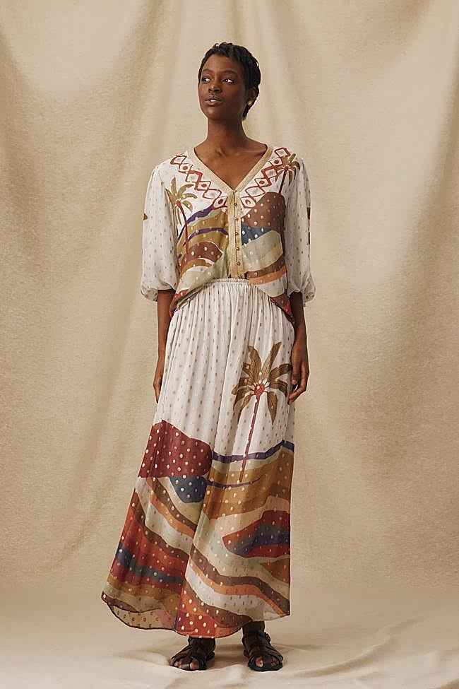 Con un estampado inspirado en el desierto, la falda Vedha de Maksu combina elegancia y estilo atemporal. De silueta fluida, está bordada con lunares metalizados que captan la luz y cuenta con cintura alta elástica para un ajuste cómodo y favorecedor. Precio: 178 euros.