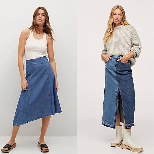 Las propuestas de Mango se desvinculan de los diseños habituales o, más bien, les dan una vuelta para que se vean fashionistas. En particular, una falda denim midi acampanada con bajo asimétrico, un corte que ha triunfado en la pasarela, y tiro alto, para que se ajuste a la cintura y defina la silueta, haciéndola más esbelta, a un precio de 29,99 euros. La otra opción incluye la tendencia del bicolor, en un vaquero azul más claro y otro oscuro, de cintura alta, en un largo midi casi maxi, abertura en el centro de la parte delantera y bajo deshilachado, muy juvenil, también por 29,99 euros.