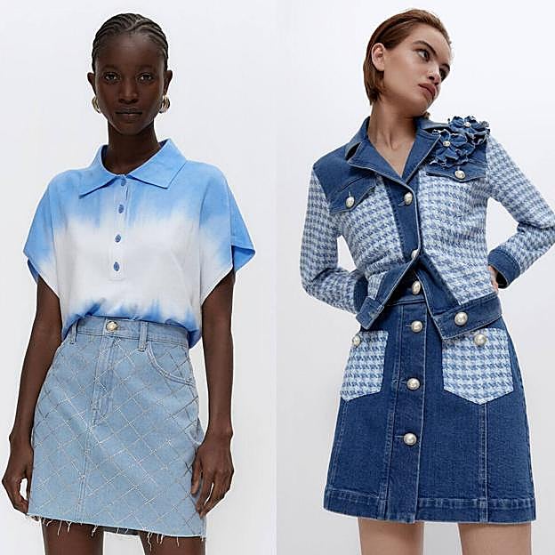 Uterqüe opta por la última corriente exitosa de mini faldas, con dos modelos tan sofisticados que sientan bien a cualquier edad. El primero, en azul claro, destaca por el bajo desflecado y un diseño de rombos por toda la falda, hechos con cristales strass, por 79 euros. En la misma línea de la pasión por la decoración y el adorno glamuroso de las prendas, está la falda denim combinada con pata de gallo azul, que se incorpora en los bolsillos delanteros, así como botones de perlas, que cuesta 69 euros y trae chaqueta a conjunto.