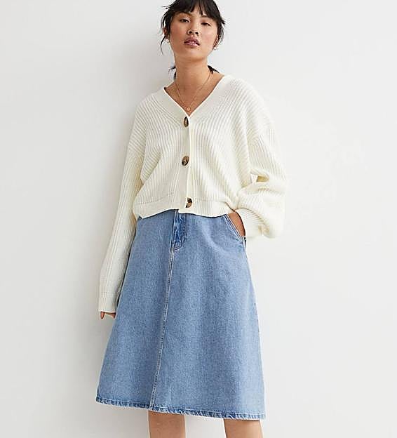 Por último, entre la gran variedad de faldas vaqueras de las que dispone H&M, nos decantamos por esta midi hasta la rodilla y de vuelo, que viene en 3 colores, azul medio, claro y negro lavado. Tanto con botas como con bailarinas y mocasines, este corte de falda es el más femenino y fácil de conjuntar, por ejemplo, con una blusa bohemia con bordados o un cárdigan en tonos pastel romántico. Aunque, si eres más grunge y rockera, decántate por la versión negra y combínala con botas militares y una chaqueta de flecos. ¿Su precio? 24,99 euros.