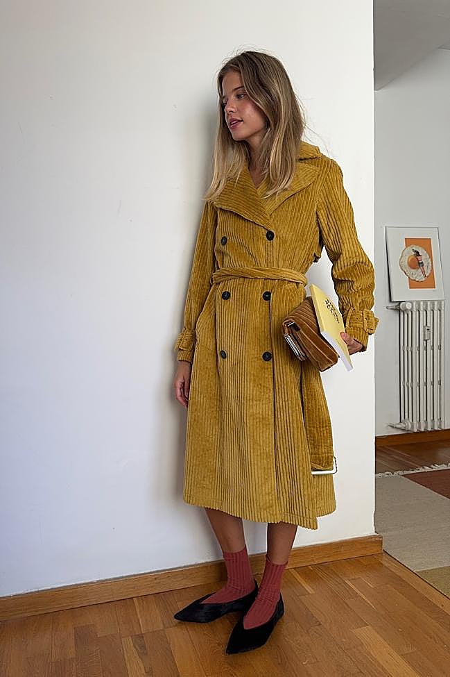 Y si no tienes claro cómo hacerlo, este trench es una de nuestras opciones favoritas. No solo por el tejido o el diseño, sino también por el color. Esta chaqueta de largo medio, manga larga, doble abotonadura y cinturón está protagonizada por un tono mostaza —un amarillo ocre oscuro— que funciona de maravilla en otoño.