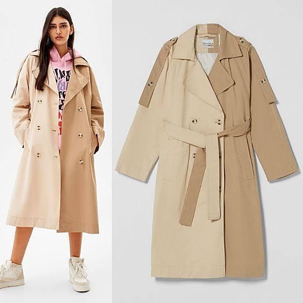 La primera opción que propone la marca más moderna de Inditex está arrasando en el street style de las semanas de la moda y se inspira en un diseño de lujo de Maison Margiela. Hablamos de una gabardina de algodón oversize en versión bicolor o dos tonos a combinación. En una parte es beige y al otro lado, camel. Tiene cierre cruzado de doble botonadura, detalles de trabilla y cinturón también bicolor a juego. ¿Su precio? 59,99 euros. Cómoda, innovadora y digna de la alta gama.
