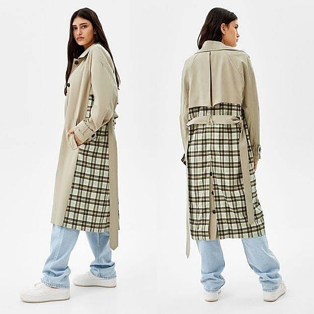 La siguiente se trata de otro modelo que está causando furor entre las influencers y es super elegante. Esta gabardina combina un color liso en tono neutro a contraste con un estampado de cuadros que decora la parte trasera. Otras características son el cuello solapa, trabillas en los puños, cierre de botones y cinturón de lazada. Un clásico renovado que puedes encontrar por el mismo precio que la anterior prenda, 59,99 euros.
