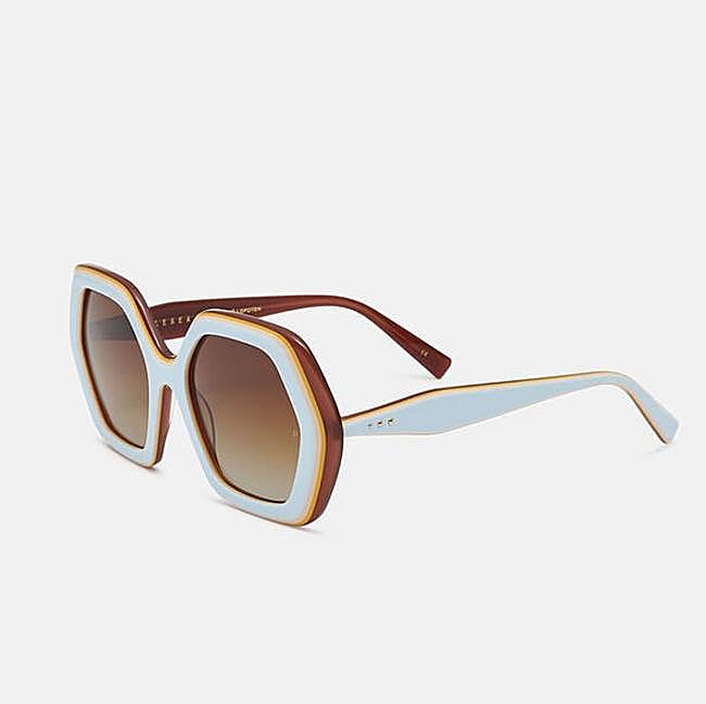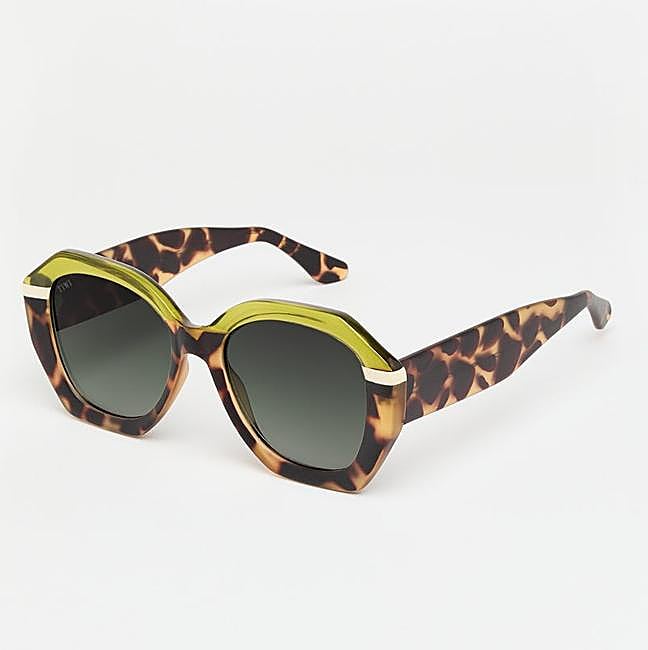 Lentes de Tiwi de alta gama que brindan 100% de protección contra los rayos UV y UVA.400 UV (Luz Ultravioleta). Tienen un diseño que combina el carey con un verde pisatacho en una gafa de diseño exagonal. Precio: 110 euros.