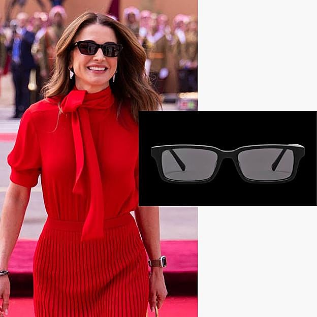 Las royals también se unen a las tendencias y Rania de Jordania ha triunfado con estas gafas de sol de color negro que puedes comprar idénticas en la firma francesa Jimmy Fairly. Es el modelo La Kos y tiene una montura de acetato con forma rectangular y de color negro. Precio: 135 euros.