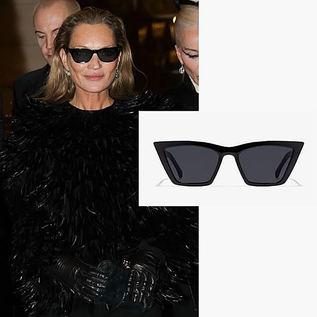 Kate Moss se ha unido a la tendencia de las gafas pequeñas y a alargadas de color negro con este modelo que ha sacado su versión sofisticada. Muy parecido lo hemos fichado en D.Franklin, con el modelo Mónaco en color negro. Cuenta con los detalles más distintivos de la marca, el logo grabado en las patillas y el emblema en la lente. Las varillas laterales tienen una longitud de 150 mm, perfectas para todos los rostros. Precio: 49,99 euros.