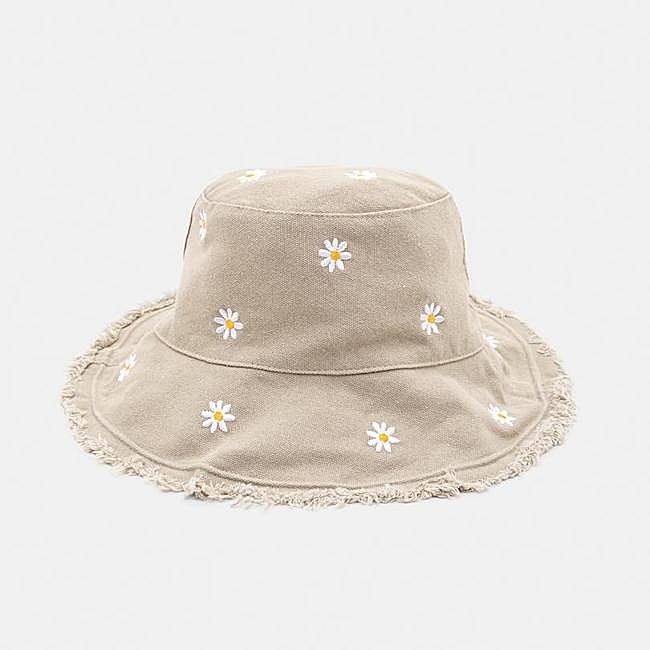 Gorro bucket de Pull&Bear que color beige. Tiene un sencillo bordado de flores y el extremo desflecado. Precio: 15,99 euros.