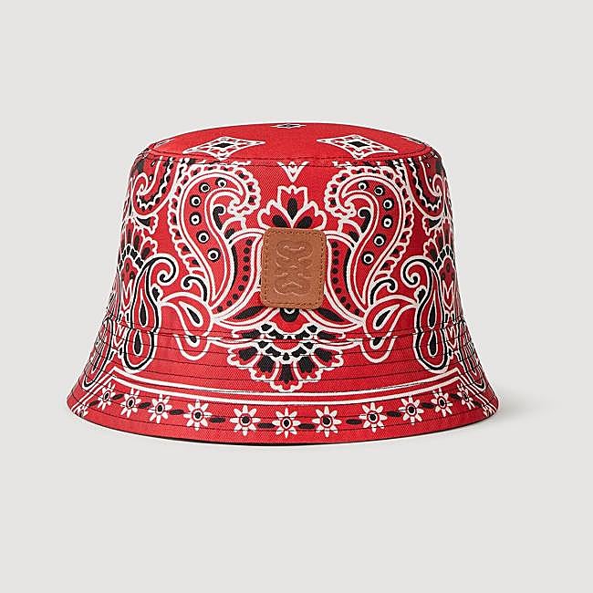 Gorro de pescador de Sandro de tela con un estampado de bandana adornado con parche de cuero en relieve. Precio: rebajado a 51 euros.