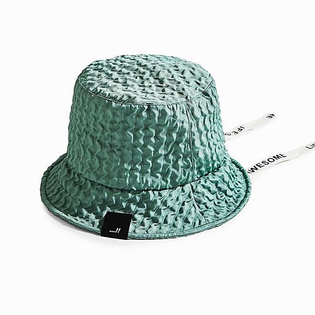 Confeccionado en un tejido con textura en color caqui, este gorro bucket de Desigual tiene una cinta con mensaje de la colección para poder ajustarlo. Precio: rebajado a 15,98 euros.