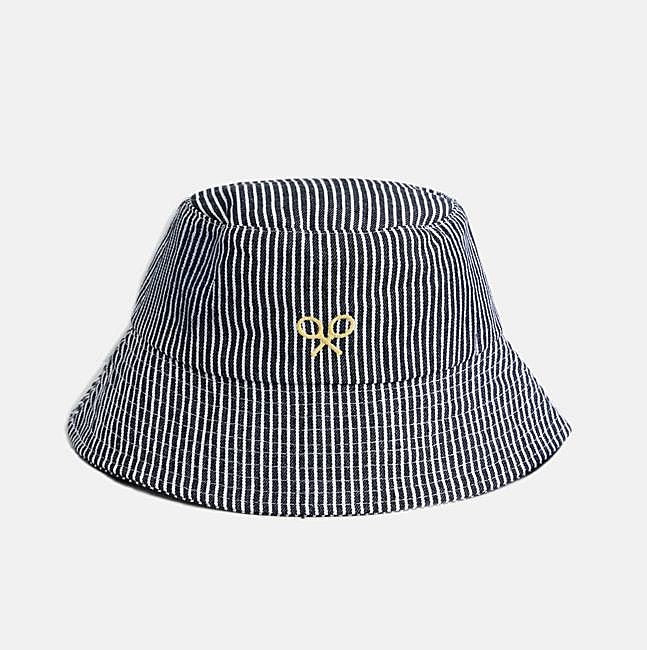 Gorro tipo bucket en tejido de rayas marino-blancas de Silbon. Presenta ajuste un mediante lazada y cuenta el logo bordado a contraste amarillo en el frontal. Precio: rebajado a 17,99 euros.