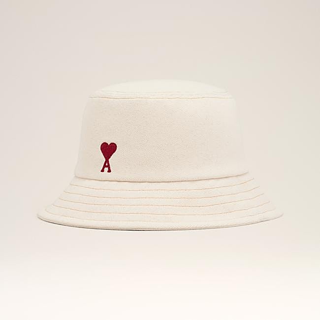 Sombrero de pescador en sarga de algodón de Ami Paris. Es de color crudo y se caracteriza por llevar el logo de la firma a contraste en color rojo en la parte frontal. Precio: rebajado a 105 euros.