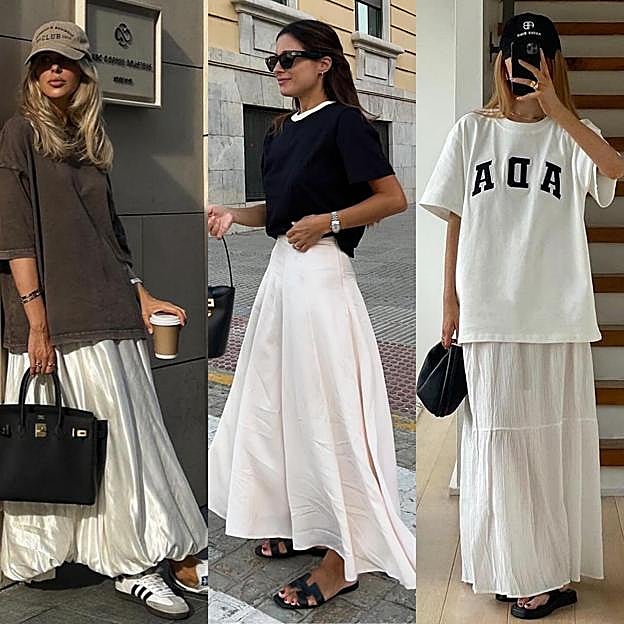 Si quires sacar la versión más cómoda de esta prenda y la quieres usar para looks de diario todoterreno, saca tu camiseta de manga corta básica del armario y añádela a tu falda larga blanca. El objetivo es crear un look de contraposiciones con una prenda inferior femenina y una superior de corte oversize mucho más masculina.