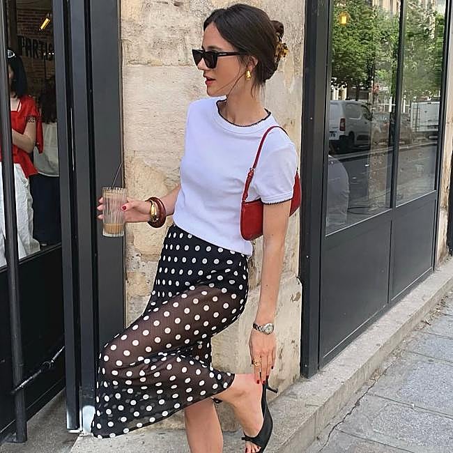 Falda de lunares con camiseta de manga corta blanca. Los lunares son un estampado clásico que siempre vuelve, y en una falda midi o corta tienen un efecto rejuvenecedor instantáneo. Combínala con una camiseta blanca de manga corta y unas sandalias para un conjunto sencillo que nunca falla.