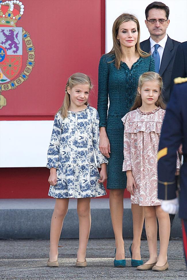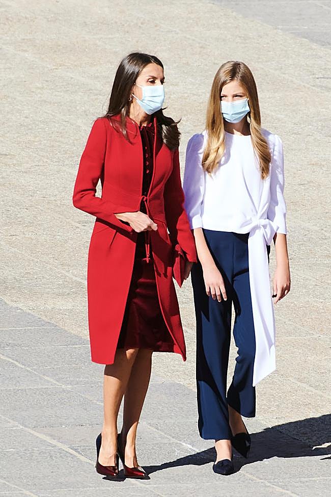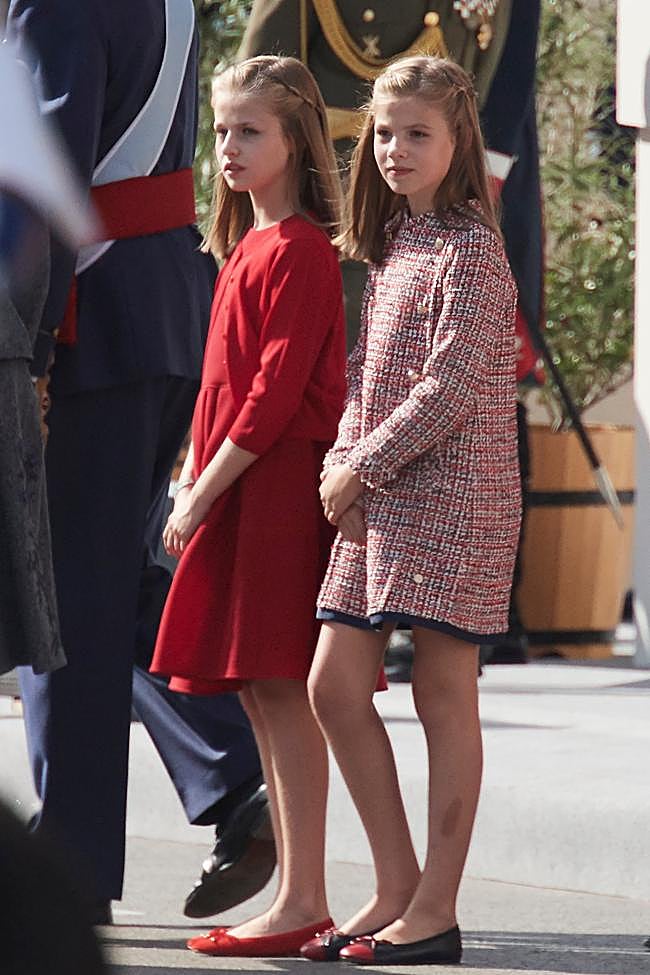 Junto a su hermana y como si fueran gemelas -a pesar de la diferencia de edad-, Sofía apareció en 2017 con este look coordinado con el de la princesa Leonor. Esta vez en rojo, llevó un abrigo tipo vestido de tweed que combinó con bailarinas bicolor a tono.