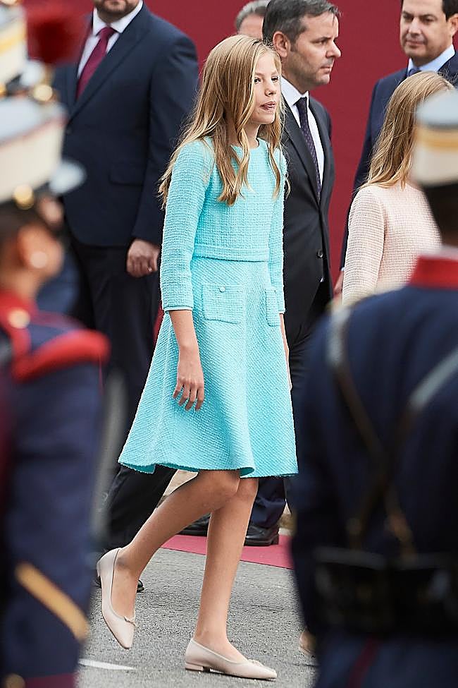 En 2019, la infanta Sofía confirmó que su color es el azul con este vestido de twwed turquesa que tan bien le sentaba. Una opción más infantil con manga francesa y falda evasé a la que añadió unas bailarinas en color nude.