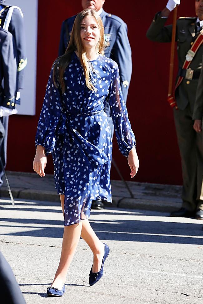 2022 fue el último año en el que la infanta Sofía estuvo en el Día de la Hispanidad y lo hizo con este vestido de lunares de Carolina Herrera. La reina ha escogido este print en varias ocasiones y la joven lo llevó en versión azul marino con unas bailarinas con lazo y punta triangular a juego.