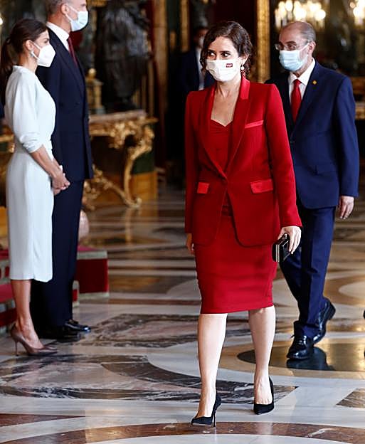 Anitta Ruiz, la experta en imagen y comunicación ha explicado: «Ayuso ha optado por su color favorito, pero luciendo nueva figura con un estupendo dos piezas con falda lápiz y ribeteados en raso. Está empezando a disfrutar con la ropa y se nota«. Y razón no le falta, un vestido satén con escote fruncido en forma de corazón y una silueta ajustada con largo por la rodilla conseguían estilizar la figura de la política. Y todo ello acompañado de una americana larga y abrochada con la que dio ese toque formal que requería el acto.