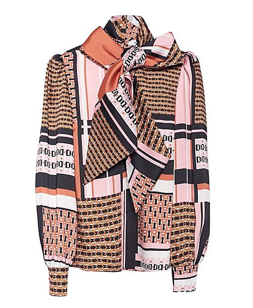 Se trata de un modelo con estampado retro en tonos rosas, anaranjados y marrones de la firma «made in Spain» Cyrana. Está confeccionada con poliéster reciclado, tiene mangas abullonadas y está estampada con un 'print' inspirado en un medallón. Pero, sin duda, lo mejor de la prenda es su diseño la lazada al cuello que aporta un toque de elegancia y estilo que favorece mucho.