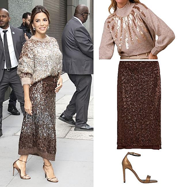 Por último, si prefieres tonalidades más neutras y que pasen más desapercibidas, el marrón chocolate es para ti. Este color, que también se lleva muchísimo este año, es una opción perfecta para lucir en Navidad. Eva Longoria lo demostró hace unos meses escogiendo una falda midi que combinó con un jersey en tonos similares. Unas sandalias de tacón metalizadas fueron el punto final perfecto para un estilismo de matrícula de honor.