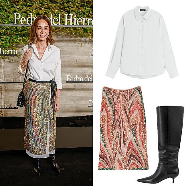 Algo parecido hizo Isabel Preysler el año pasado, posando en un photocall con una falda de lentejuelas y apostando por ese toque clásico y elegante que tanto encaja en esta época del año. En vez de añadir un jersey o una prenda más abrigada, recurrió a la típica camisa blanca que todas tenemos en el armario y que siempre es un acierto seguro. Además, optó por una combinación mucho más cómoda al completar el look con unas botas altas de color negro.