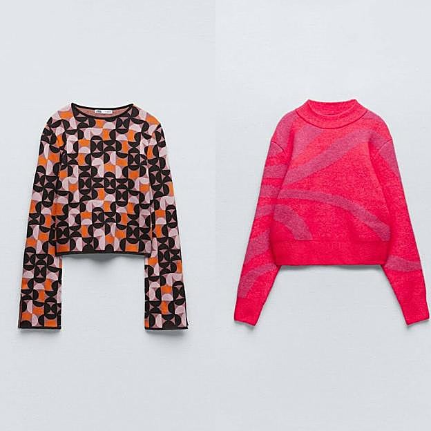 En los estampados tendencia encontramos este jersey de punto jacquard con cuerpo corto y manga larga acabada en abertura, que se decora con un estampado geométrico en tonos negro, naranja y rosa, por un precio de 29,95 euros. Y, también está la opción de este jersey de silueta relajada con hombros caídos y cuello subido, en estampado de rayas asimétricas onduladas color rosa fucsia, a solo 25,95 euros.