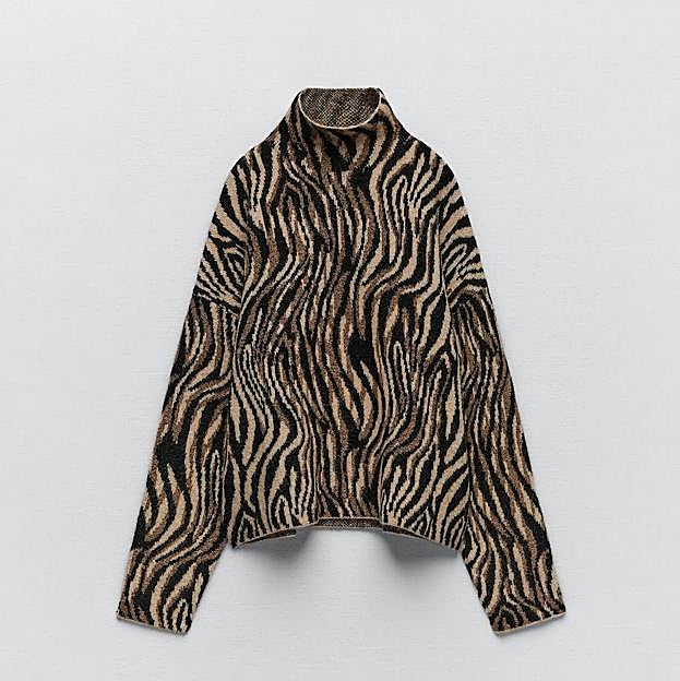 Mientras que las adictas a las gangas con estilo más clásico, deben hacerse con este jersey jacquard con cuello subido y animal print, en negro y marrón. Está ahora en la sección de Special Prices, con un descuento 45% por 15,99 euros y a puntito de agotarse.