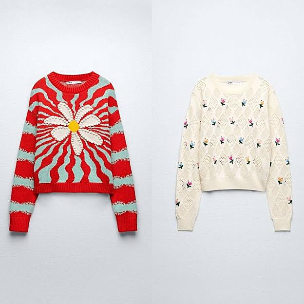 La primavera es tiempo de flores y nuestro outfit también se adorna de su favorecedora estética. Por ejemplo, con este jersey estilo retro de punto jacquard y acabados en rib, muy alegre, que combina estampado a rayas y ondas con una maxi flor decorada con pompones en relieve, tonos rojo y azul, disponible por 29,95 euros. Aunque si tienes gustos más románticos, déjate conquistar por este jersey de punto calado con pequeñas flores multicolor bordadas a contraste, sobre un tono neutro, al mismo precio que el anterior.