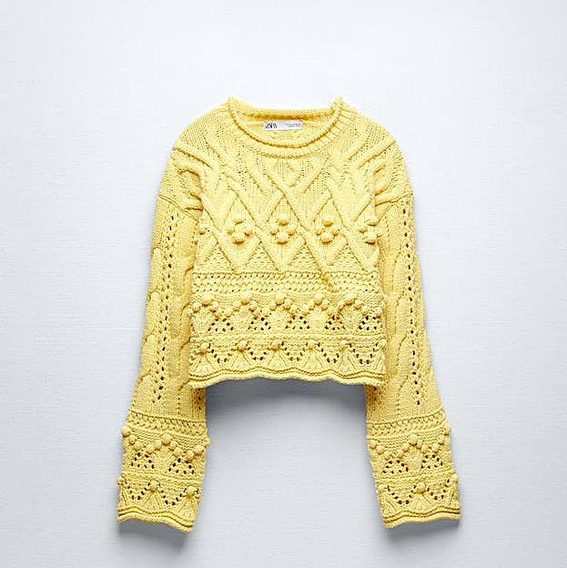 Las que prefieran los jerséis lisos, pero necesiten de un color que ilumine su apariencia para rejuvenecer, se decantarán por este jersey cropped de punto trenzado con detalles de calados y pompones, en tono amarillo pastel, con un coste de 29,95 euros.