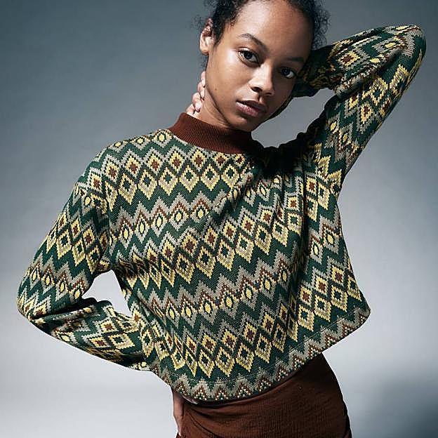 Otro de sus modelos es estilo crop de jacquard, estampado al completo de zigzag que forma rombos en tonos verdes, amarillos y marrones, cuello rib subido a contaste y a un costo de 19,95 euros. Va genial con una falda de tubo o plisada y botas altas, junto a un pantalón de traje marrón y unos botines planos o, con un vaquero tipo 'mom jean' y unos mocasines con calcetines o deportivas, para obtener un look muy ochentero.