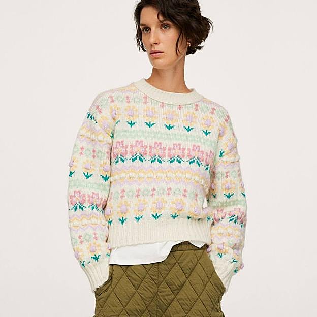 La primera versión de Mango se trata de un jersey oversize de apariencia vintage años 90, con cuello redondo y diseño combinado, intercalando cenefas en mangas, puños y bajo, con el estampado clásico fair isle, en tonos naranjas, burdeos, marrones y azules, por un precio de 39,99 euros. Ideal para recrear el look inglés de campo, con pantalones de cuadros o leggings y, botas altas de piel o de agua.
