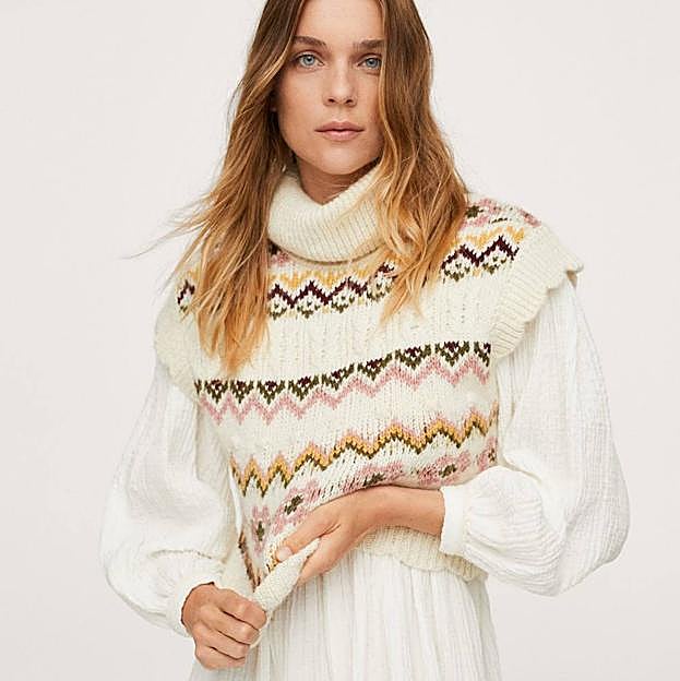 La última opción de Mango es el tan deseado y popular chaleco de punto, de cuello vuelto, con terminaciones en canalé festoneadas y en crudo, con print en zigzag y flores, que puede ser tuyo por 29,99 euros. Póntelo encima de un maxi vestido vaporoso o estampado floral con botas cowboy o, con una camisa oversize blanca, unas bermudas y unos mocasines.