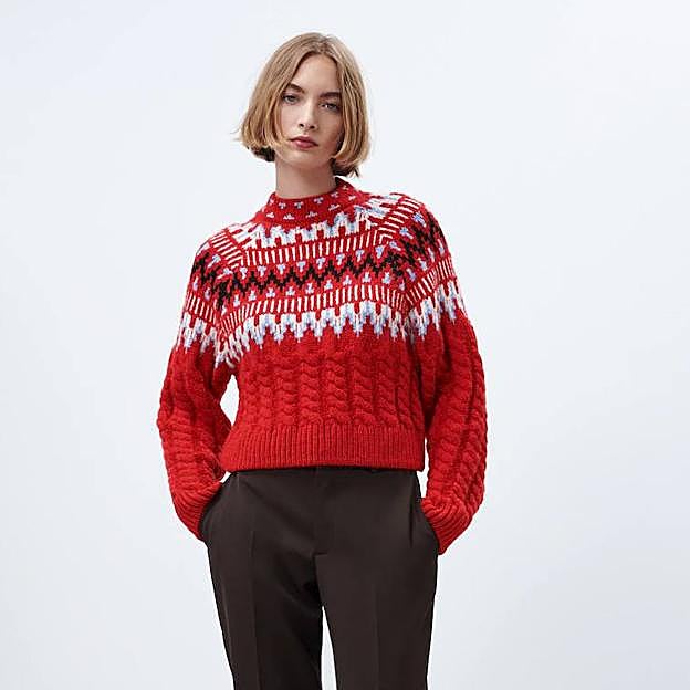 Para terminar, Zara propone un jersey de punto oversize con unos colores y patrones muy invernales, rojos, azules y blancos, con acabados de canalé, por 29,95. Si tienes que elegir una prenda de punto versátil, atemporal, favorecedora y de aspecto vintage, debe ser esta, sin discusiones.