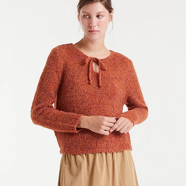 Si te gustan los colores favorecedores, prueba con este jersey de punto con textura de color naranja-teja de Compañía Fantástica. Destaca por tener un cuello redondo con el detalle en el escote anudado en forma de lazo. Precio: 44,95 euros.