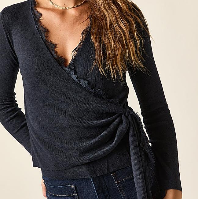 Este jersey de punto azul marino de Algo Bonito tiene un diseño cruzado con lazo lateral ajustable. Lleva el escote en pico adornado con un delicado ribete de encaje que aporta un aire femenino y sutil, manga larga y corte entallado que estiliza la silueta. Precio: 39,99 euros.