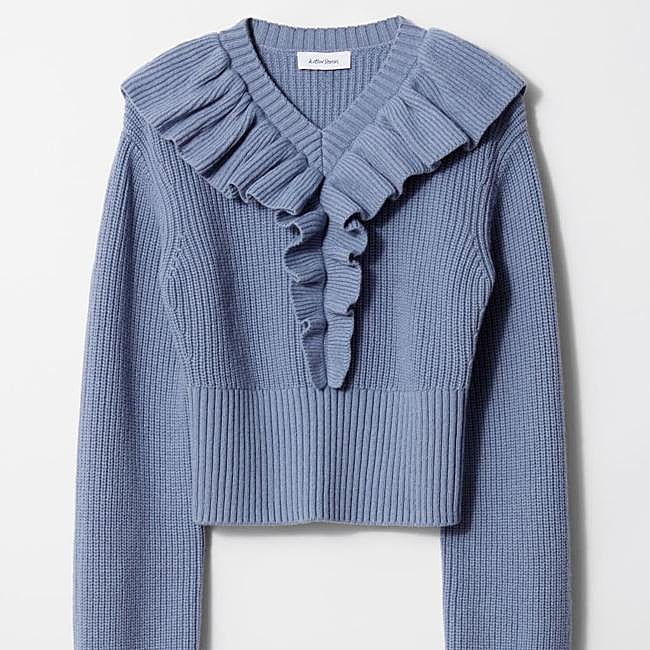 En la sección de descuentos de & Other Stories hemos fichado este jersey de escote en pico tejido en mezcla de lana y diseñado con detalles de volantes en la parte delantera. Precio: rebajado a 49 euros.