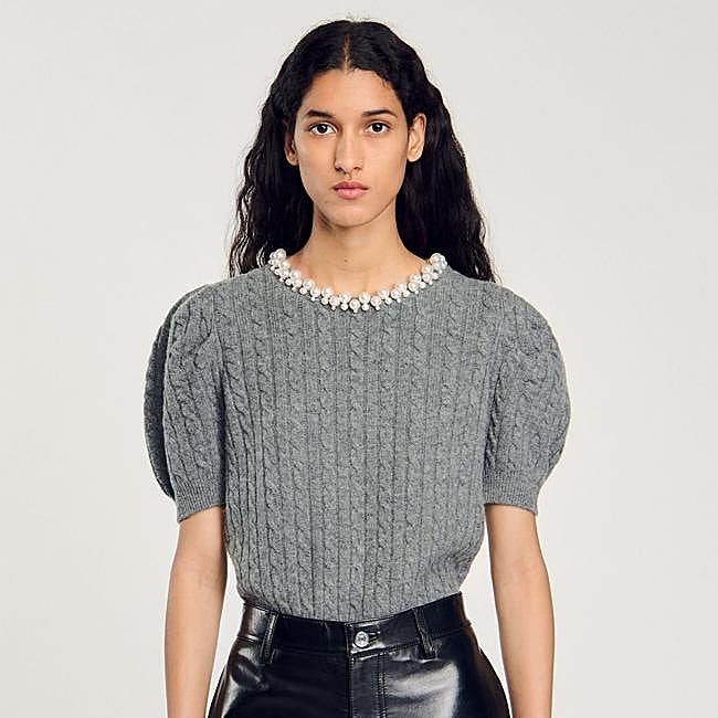 Por último, para las más elegantes, proponemos este modelo de Sandro. Es un jersey de punto trenzado de lana y cachemira, con manga corta y cuello redondo decorado con perlas. Precio: 97,5 euros.