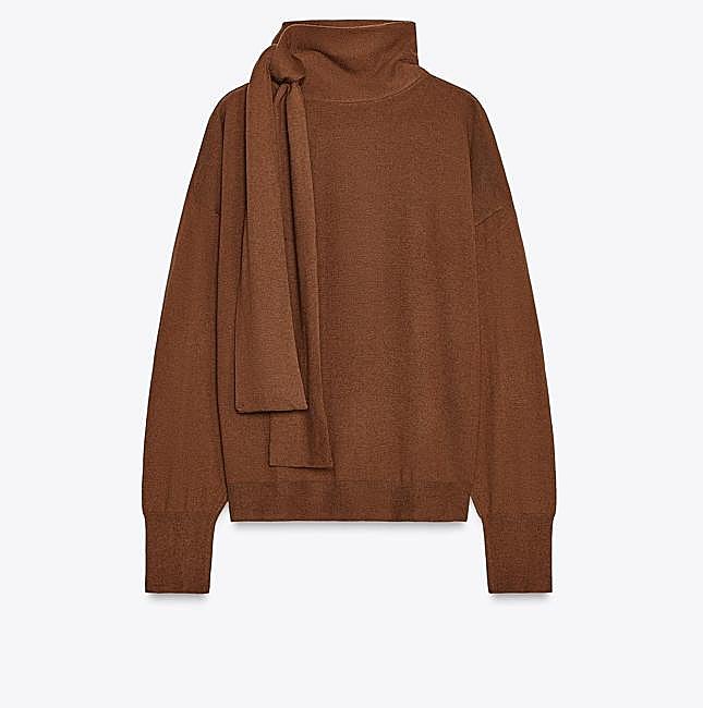 Para las que buscan piezas básicas, en Zara tienen este jersey confeccionado en hilatura con lana 5%. Destaca por tener un cuello redondo adornado con un lazo en el mismo tejido. Precio: 25,95 euros.