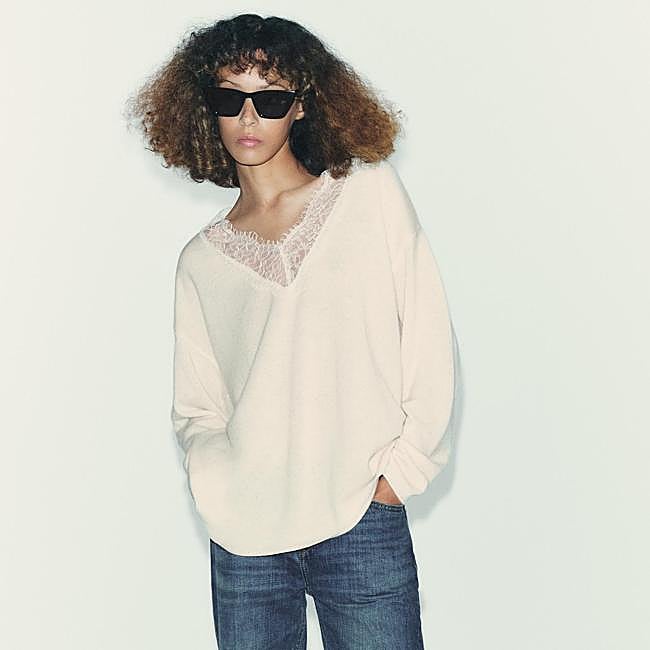 Otra opción de Zara es este jersey confeccionado con lana en color crudo. En este caso, se ha colado en la lista por tener un escote en forma de pico con encaje y manga larga. Precio: 39,95 euros.