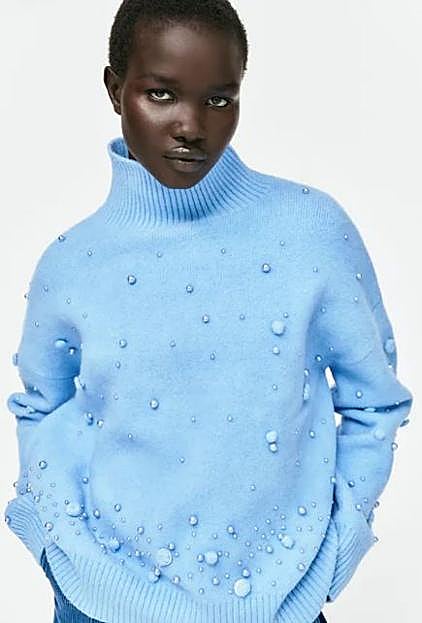 Se trata de un jersey de punto en color azul bebé, que tiene un diseño oversize con cuello subido y manga larga. Hasta ahí, es un modelo básico con un color súper favorecedor que todas podemos tener similar en casa. Sin embargo, esta prenda lleva unas lentejuelas y unos apliques repartidos por el todo el jersey, que lo convierten en uno de los más especiales del momento. Cuesta 49,95 euros y es tan ideal que la talla L ya está agotada en la web de la firma.