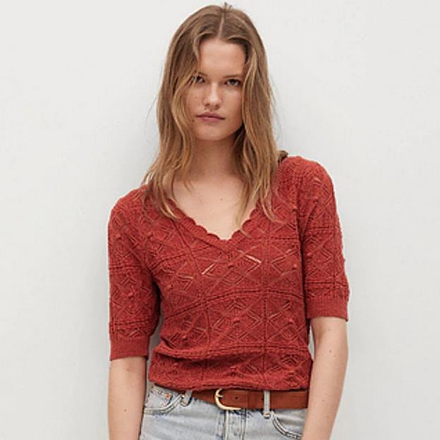 Disponible en crudo o en rojo, este jersey de manga corta está confeccionada en tejido de algodón con punto calado, una apuesta ligera y perfecta para las jornadas más calurosas.