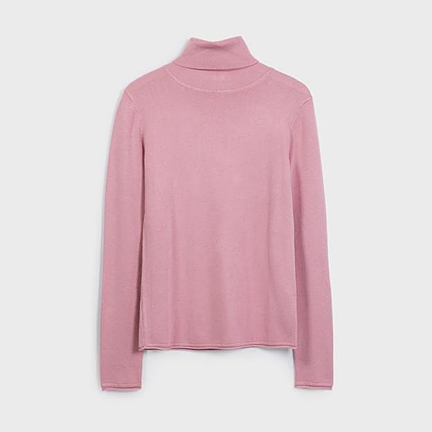 Eso sí, para copiarle sin que suponga un gran gasto, hemos encontrado las dos piezas principales del tablero en la nueva colección de Stradivarius. La primera, un jersey rosa básico con cuello cisne y punto fino. Una compra barata (cuesta 12,99 euros) y altamente versátil para llevar con otros diseños.