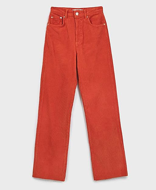 Para la parte de abajo, hemos seleccionado unos pantalones de pana muy similares. Son de tiro alto, tiene cinco bolsillos y lleva con pernera recta. Eso sí, el color torna más hacia un naranja muy oscuro, pero el efecto potenciador es exactamente el mismo. Cuestan 25,99 euros en Stradivarius y ya se están empezando a agotar en algunas tallas. ¡Hora de marcarse un Victoria Beckham!