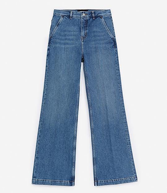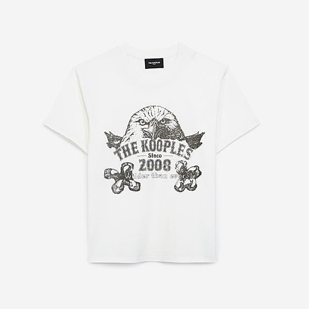 Se trata de unos vaqueros de pernera recta en color azul que realzará numerosas siluetas gracias a sus piernas ahusadas, que se ven favorecidas por el pliegue y un discreto dobladillo en el bajo. Además, cuenta con bolsillos laterales en la parte delantera y bolsillos de parche en la parte trasera. Cuestan 175 euros y Juana los combinó con una camiseta blanca también original. En vez de apostar por un diseño básico, escogió una de The Kooples (85 euros) con el dibujo de un águila con la que aportó frescura y un toque rejuvenecedor.