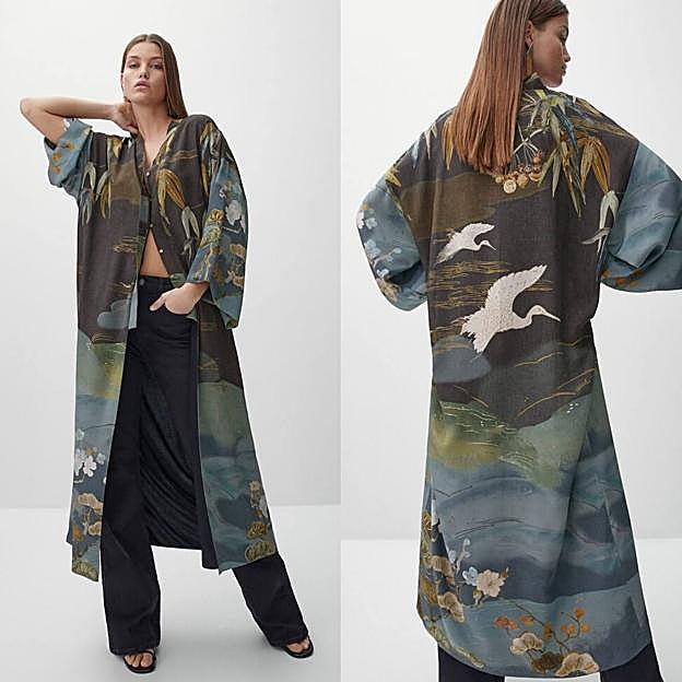 El primer modelo lo encontramos en Massimo Dutti y se trata de un kimono largo 100% seda, con corte fluido, manga ancha acampanada, cierre mediante botones ocultos con tapeta y estampado estilo oriental, disponible en las tallas XS-S o M-L, por un precio de 169 euros. Perfecto para lucir junto a un total look negro, con vestidos maxi o midi vaporosos, un conjunto de punto o vaqueros acampanados con jersey de cuello alto y botas de tacón.