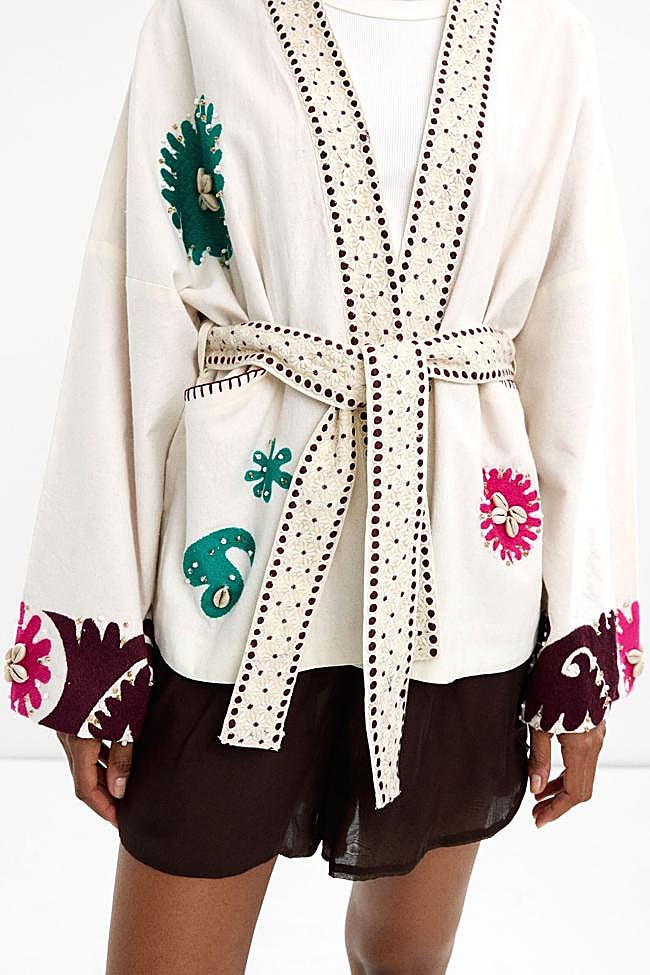 Este es un kimono corto de Parfois está adornado por unos veraniegos bordados de colores llamativos. Tiene apliques en forma de concha y un motivo en la espalda precioso y que marcará la diferencia. Precio: 39,99 euros.