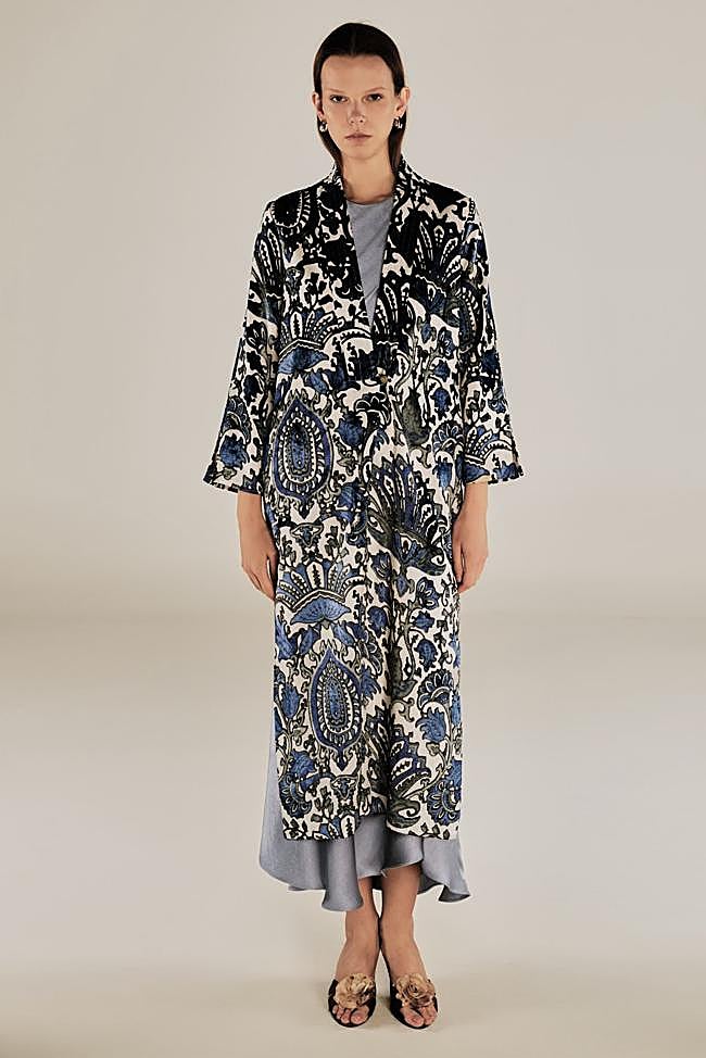 El kimono Cianita en azul de Maksu es una lujosa fusión de estilo bohemio y sofisticación. Con un corte relajado y fluido, exhibe un sorprendente diseño de terciopelo de inspiración barroca que aporta una estética atemporal a cualquier armario. Precio: 198 euros.