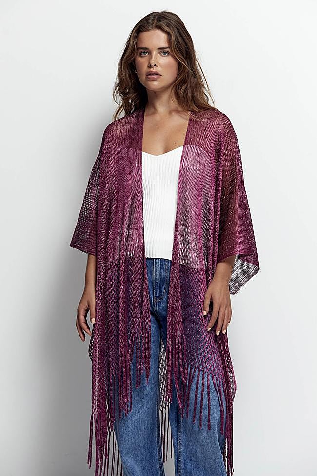 Por último, ficha este diseño tan original de Sfera. En color buganvilla, es un kimono de rejilla confeccionado con lúrex y con el bajo con flecos. Precio: 15,99 euros.