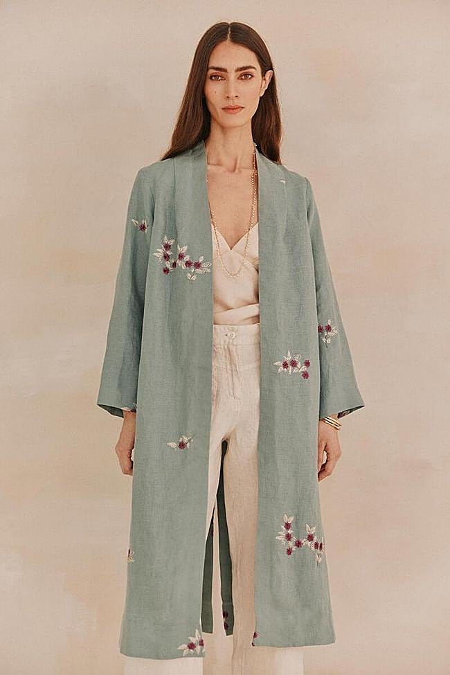 Kimono sostenible de Vida y Milagros de estilo mediterráneo, cómodo de llevar y con el que lograr un look fresco, casual y original. Un kimono ligero con estampado de rayas y combinación de colores, pensado para llenarte de luz y alegría en primavera y verano. Precio: 195 euros.