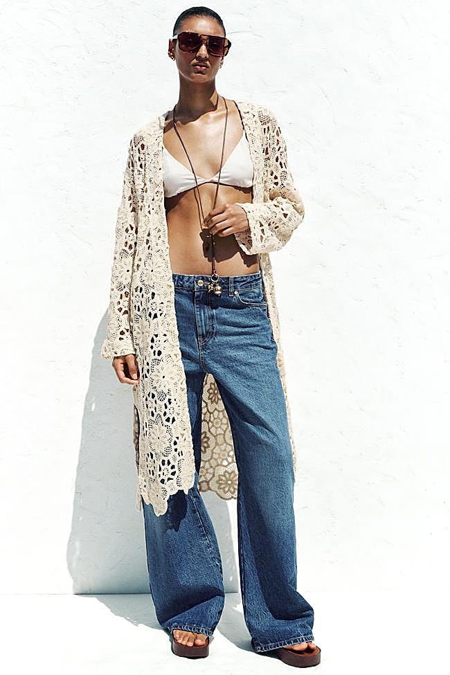En Zara hemos encontrado esta opción de crochet. Es un kimono con manga larga y el bajo con aberturas laterales confeccionado en un color beige claro súper ponible. Precio: 59,95 euros.